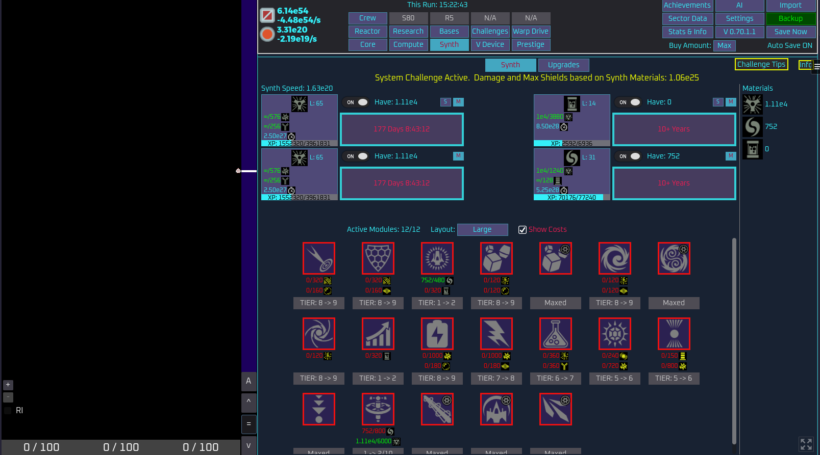 I just finished all in the synth tab. I have yet to buy al warp synth upgrades. With the crew members that buff the synth I maxed out the last 3 things in there from almost the beginning to the infinite in like half an hour. :D